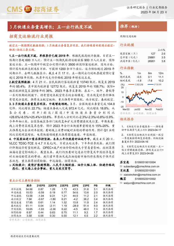 【海通证券】【20230423】招商交运物流行业周报:3月快递业务量高增长;五一出行热度不减-16页