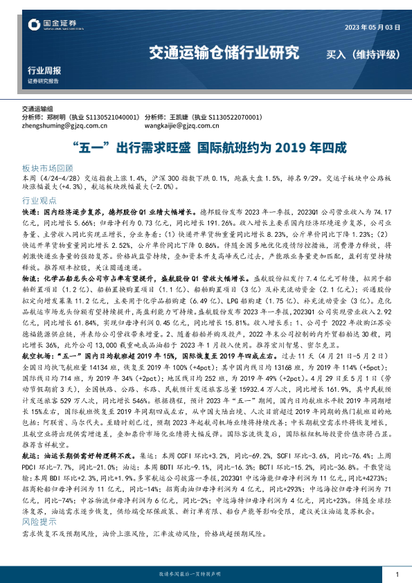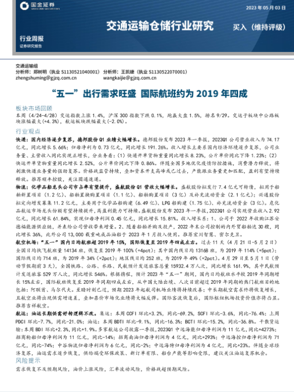 【国金证券】【20230503】交通运输仓储行业研究:“五一”出行需求旺盛 国际航班约为2019年四成-14页