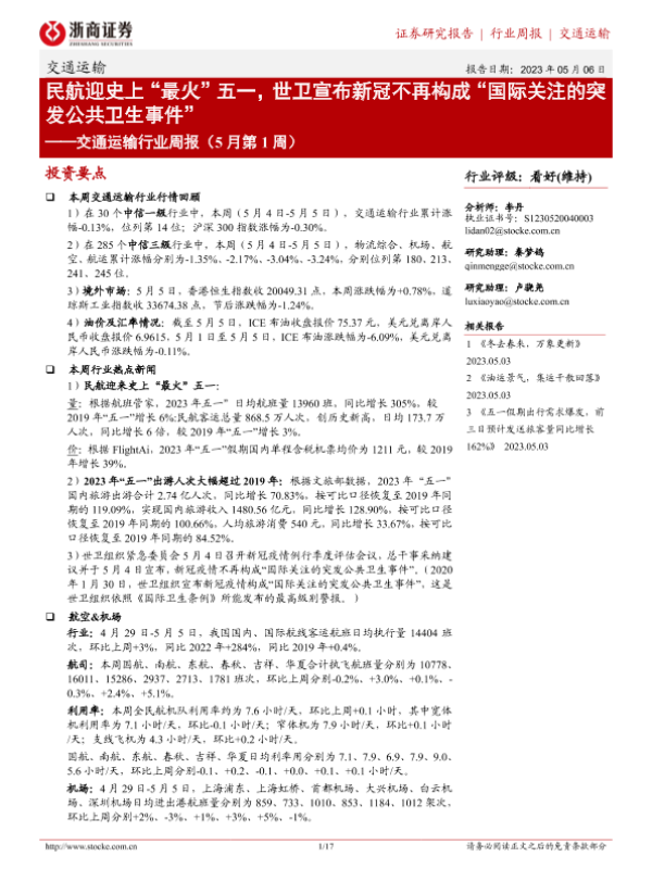 【浙商证券】【20230506】交通运输行业周报:民航迎史上“最火”五一,世卫宣布新冠不再构成“国际关注的突发公共卫生事件”-17页