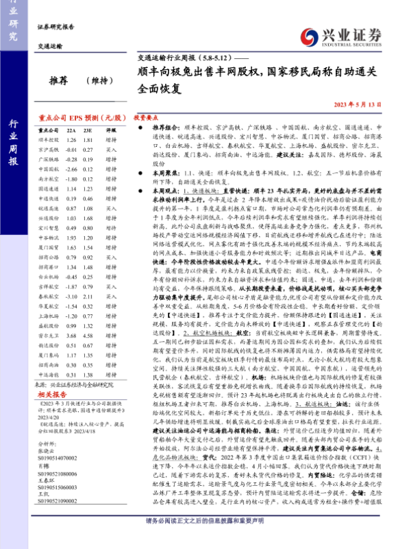 【兴业证券】【20230513】交通运输行业周报:顺丰向极兔出售丰网股权,国家移民局称自助通关全面恢复-24页