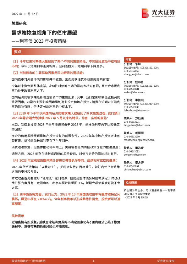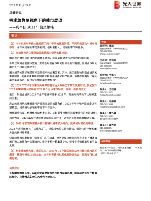 【光大证券】【20221122】利率债2023年投资策略:需求端恢复视角下的债市展望-25页