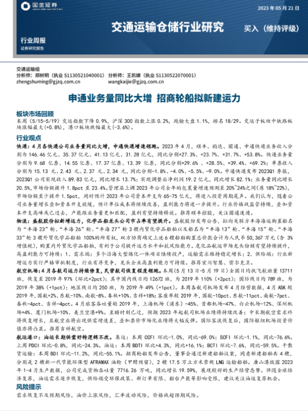 【国金证券】【20230521】交通运输仓储行业周报:申通业务量同比大增 招商轮船拟新建运力-14页