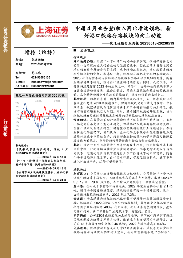 【上海证券】【20230522】交通运输行业周报:申通4月业务量收入同比增速领跑,看好港口铁路公路板块的向上动能-12页