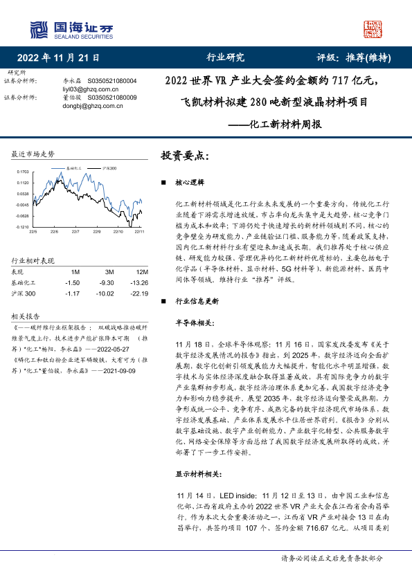【国海证券】【20221121】化工新材料行业周报:2022世界VR产业大会签约金额约717亿元,飞凯材料拟建280吨新型液晶材料项目-36页