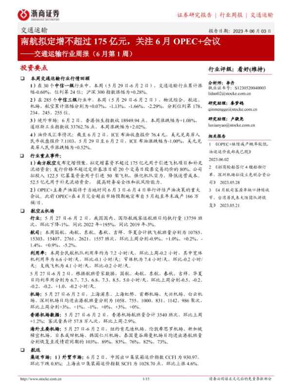 【浙商证券】【20230603】交通运输行业周报:南航拟定增不超过175亿元,关注6月OPEC+会议-15页