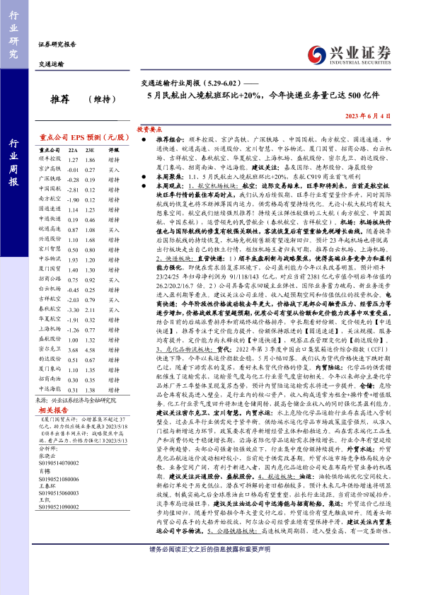 【兴业证券】【20230604】交通运输行业周报:5月民航出入境航班环比+20%,今年快递业务量已达500亿件-24页