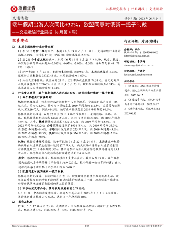 【浙商证券】【20230624】交通运输行业周报:端午假期出游人次同比+32%,欧盟同意对俄新一揽子制裁-17页