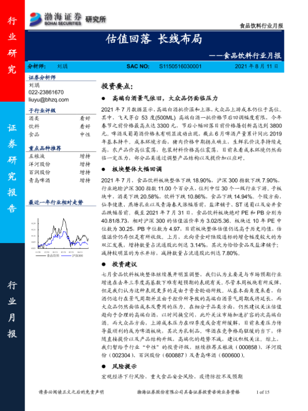 【渤海证券】【20210811】食品饮料行业月报:估值回落,长线布局-15页