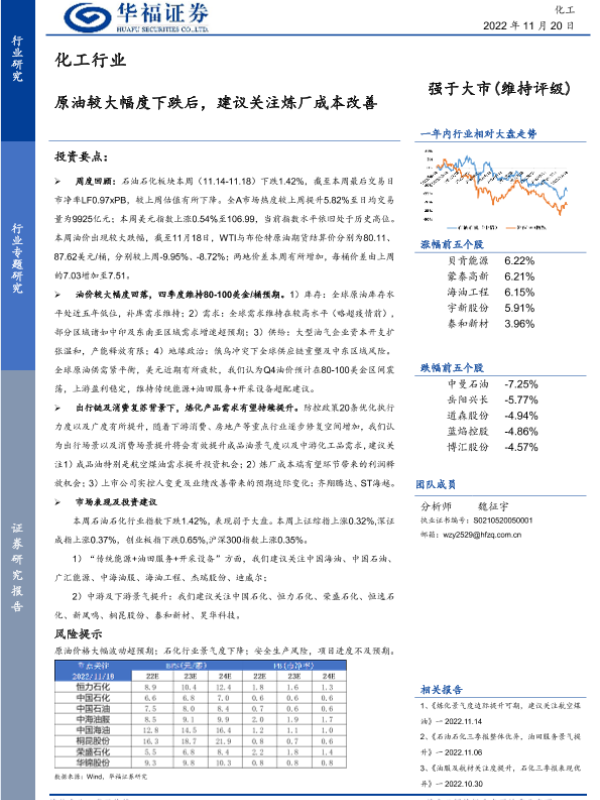 【华福证券】【20221120】化工行业:原油较大幅度下跌后,建议关注炼厂成本改善-21页