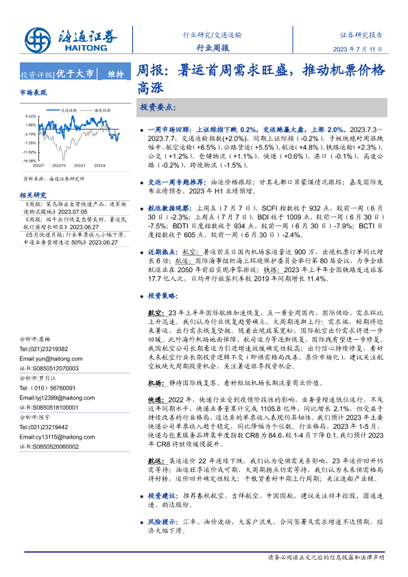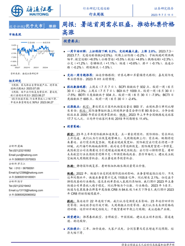 【海通证券】【20230711】交通运输周报:暑运首周需求旺盛,推动机票价格高涨-10页