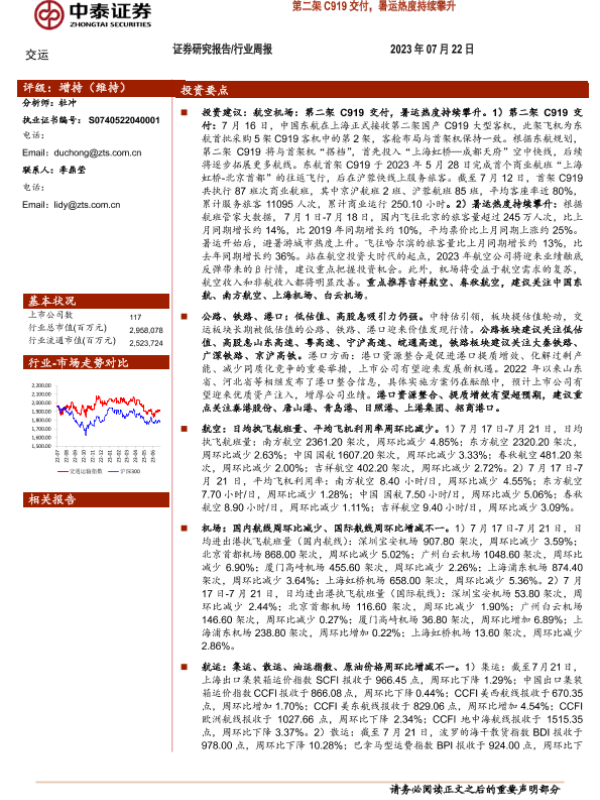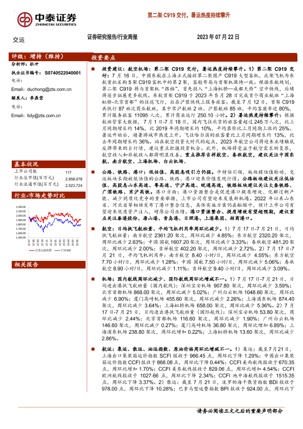 【中泰证券】【20230722】交运行业周报:第二架C919交付,暑运热度持续攀升-40页