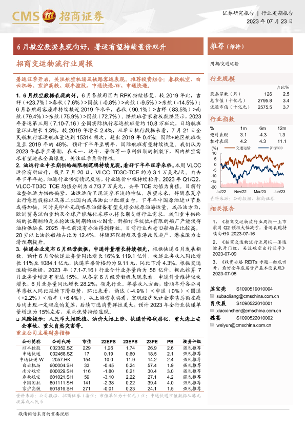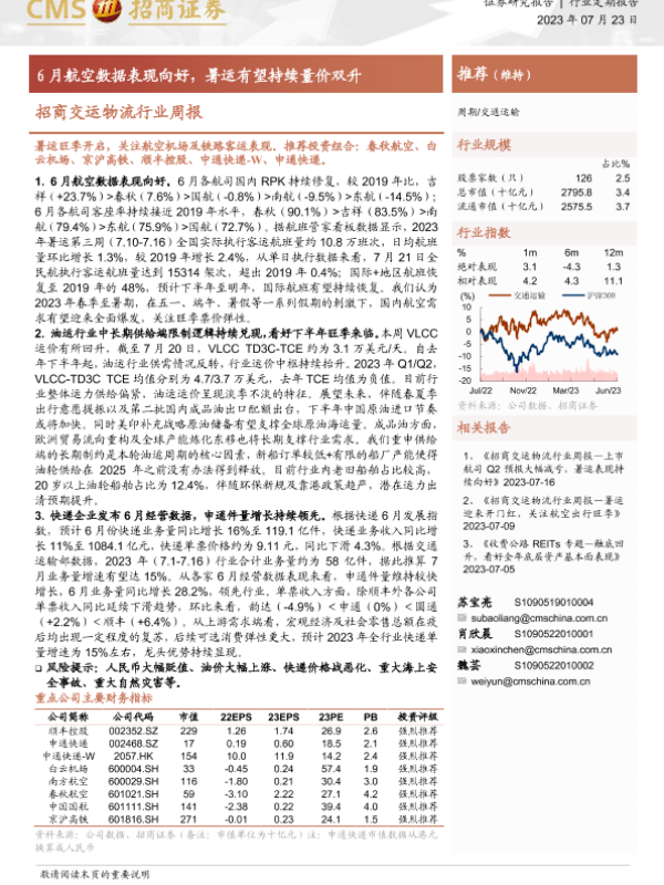 【海通证券】【20230723】招商交运物流行业周报:6月航空数据表现向好,暑运有望持续量价双升-18页