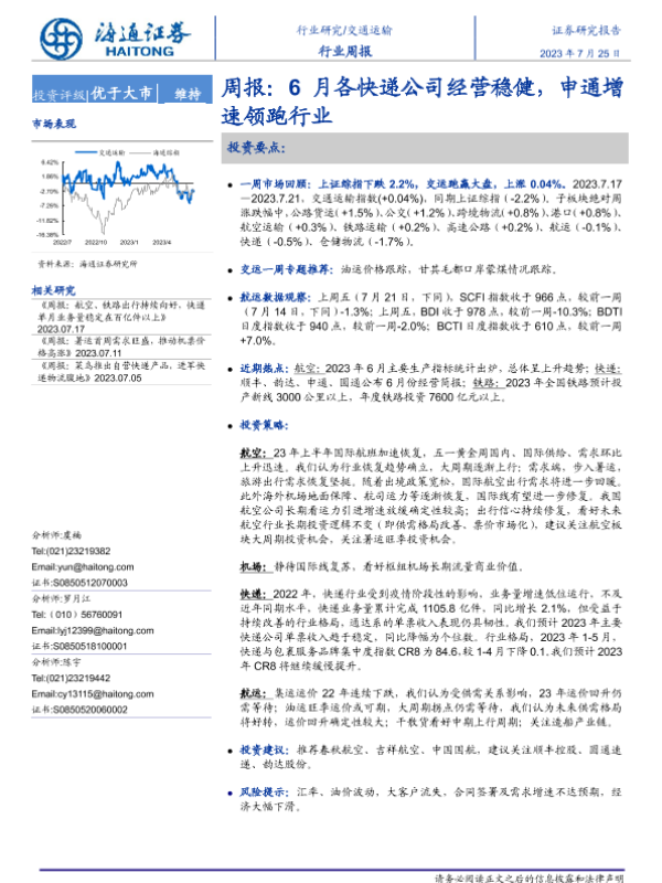 【海通证券】【20230725】6月各快递公司经营稳健,申通增速领跑行业-10页