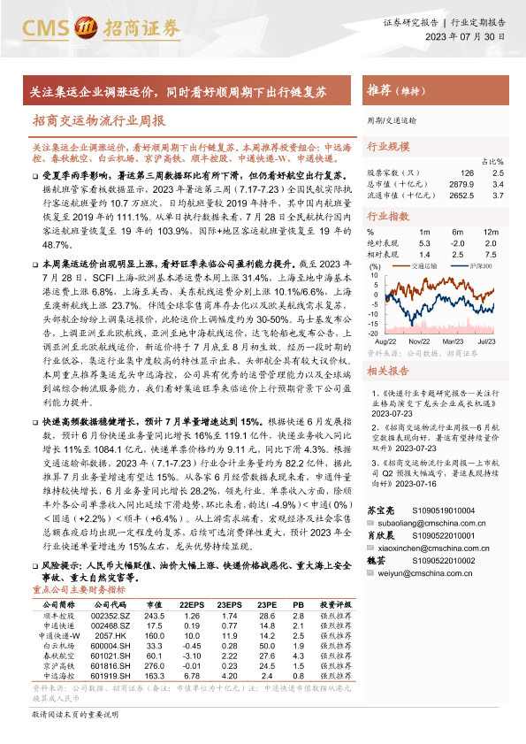 交通运输 快递业务增长 航空出行复苏 运价上涨 集运企业