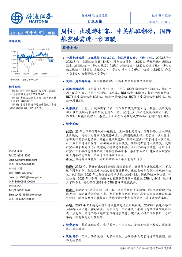 【海通证券】【20230814】交通运输周报:出境游扩容、中美航班翻倍,国际航空供需进一步回暖-10页