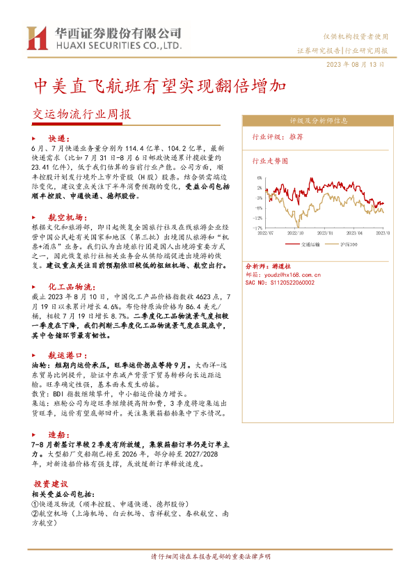 【华西证券】【20230813】交运物流行业周报:中美直飞航班有望实现翻倍增加-23页