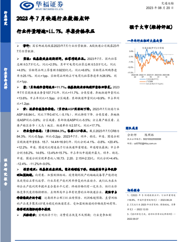 【华福证券】【20230820】2023年7月快递行业数据点评:行业件量增速+11.7%,单票价格承压-12页