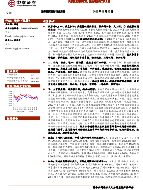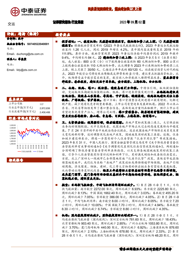 【中泰证券】【20230902】交运行业周报:民航暑运圆满收官,燃油附加费二次上调-40页