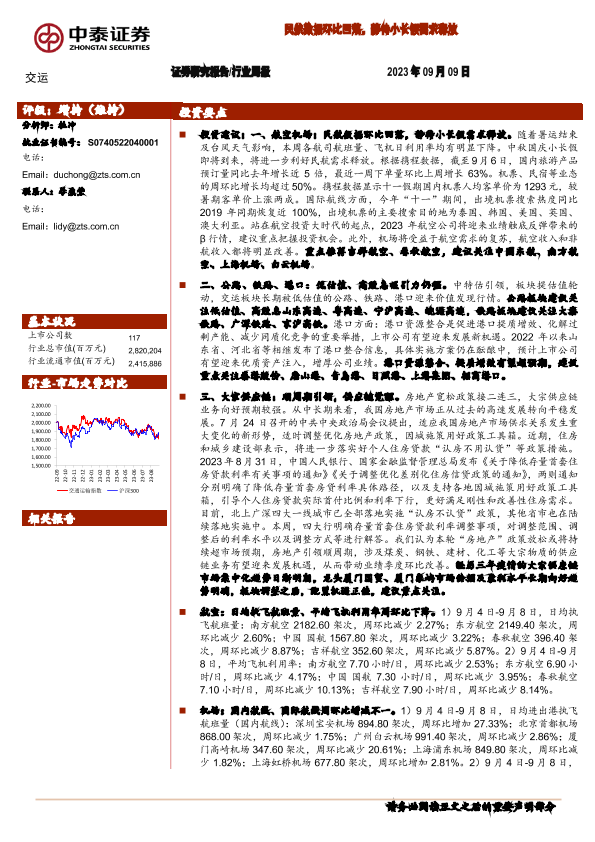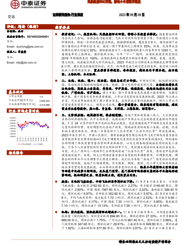 【中泰证券】【20230909】交运行业周报:民航数据环比回落,静待小长假需求释放-40页