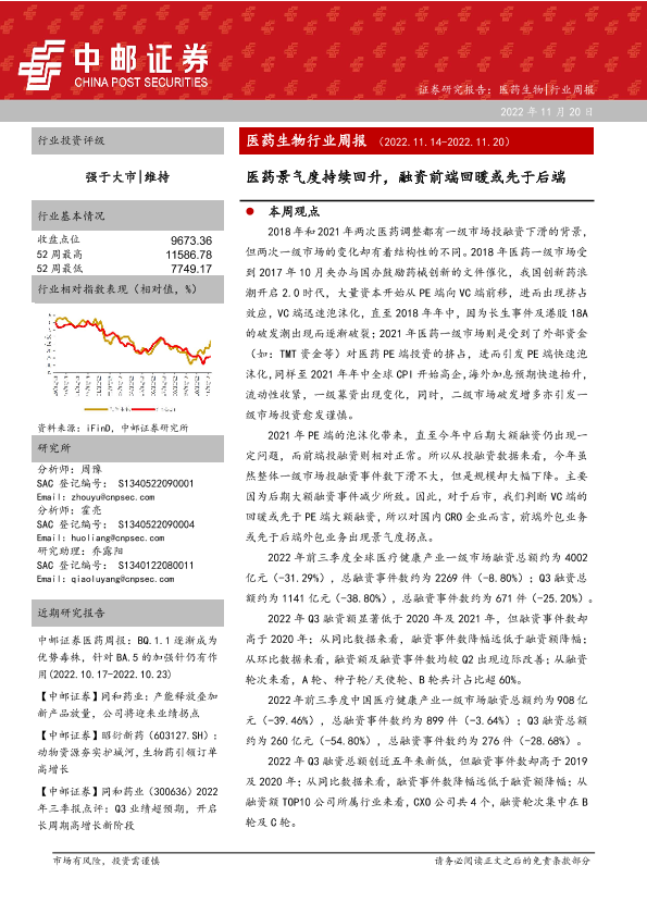 【中邮证券】【20221120】医药生物行业周报:医药景气度持续回升,融资前端回暖或先于后端-22页
