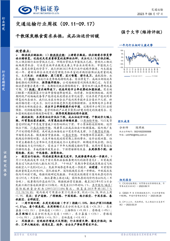 【华福证券】【20230917】交通运输行业周报:干散煤炭粮食需求共振,成品油运价回暖-14页