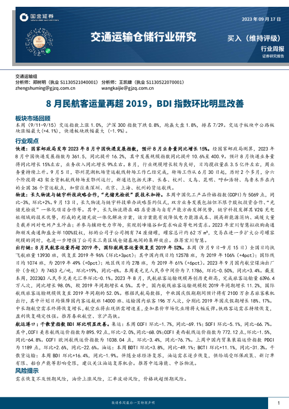 【国金证券】【20230917】交通运输仓储行业研究:8月民航客运量再超2019,BDI指数环比明显改善-14页