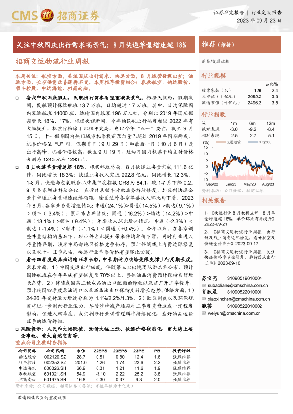 【海通证券】【20230923】招商交运物流行业周报:关注中秋国庆出行需求高景气;8月快递单量增速超18%-17页