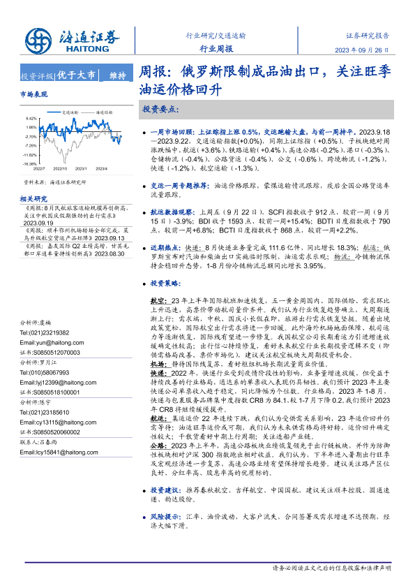 【海通证券】【20230926】交通运输周报:俄罗斯限制成品油出口,关注旺季油运价格回升-11页