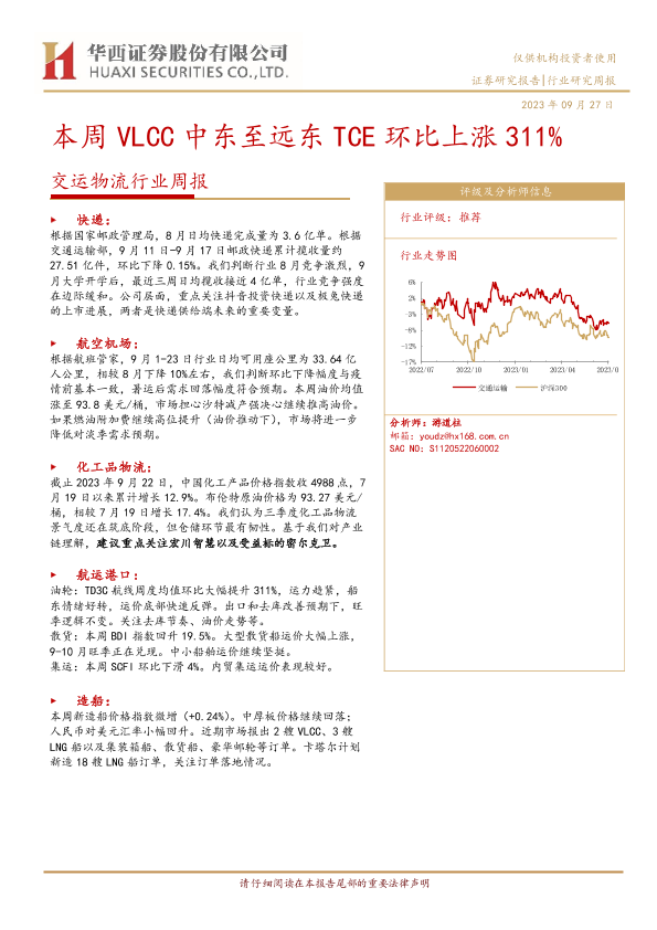 【华西证券】【20230927】交运物流行业周报:本周VLCC中东至远东TCE环比上涨311%-20页