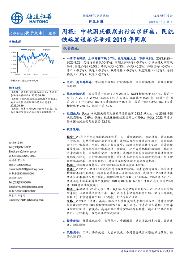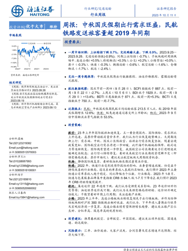 【海通证券】【20231011】交通运输周报:中秋国庆假期出行需求旺盛,民航铁路发送旅客量超2019年同期-11页