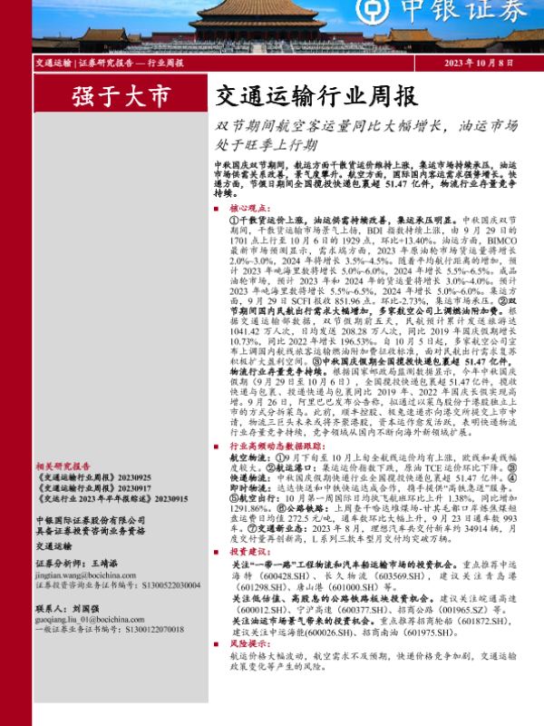 【中银证券】【20231008】交通运输行业周报:双节期间航空客运量同比大幅增长,油运市场处于旺季上行期-32页