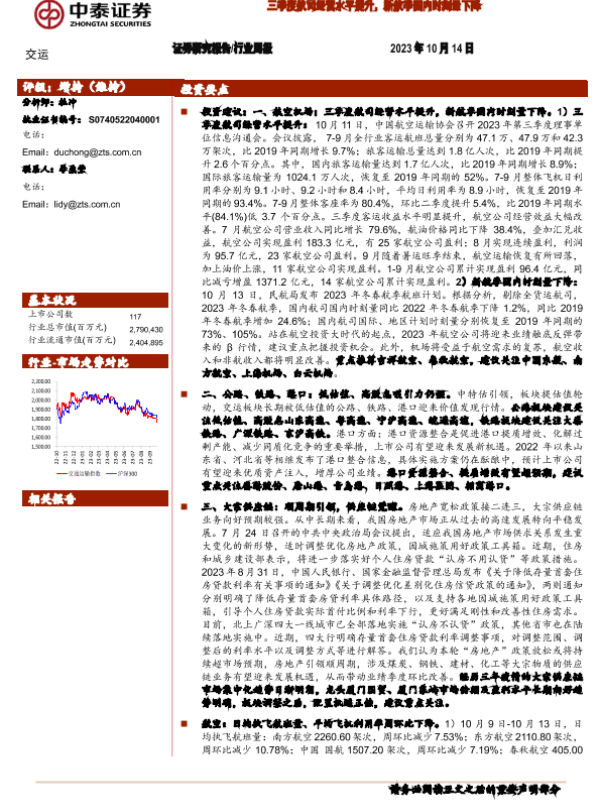 【中泰证券】【20231014】三季度航司经营水平提升,新航季国内时刻量下降-41页