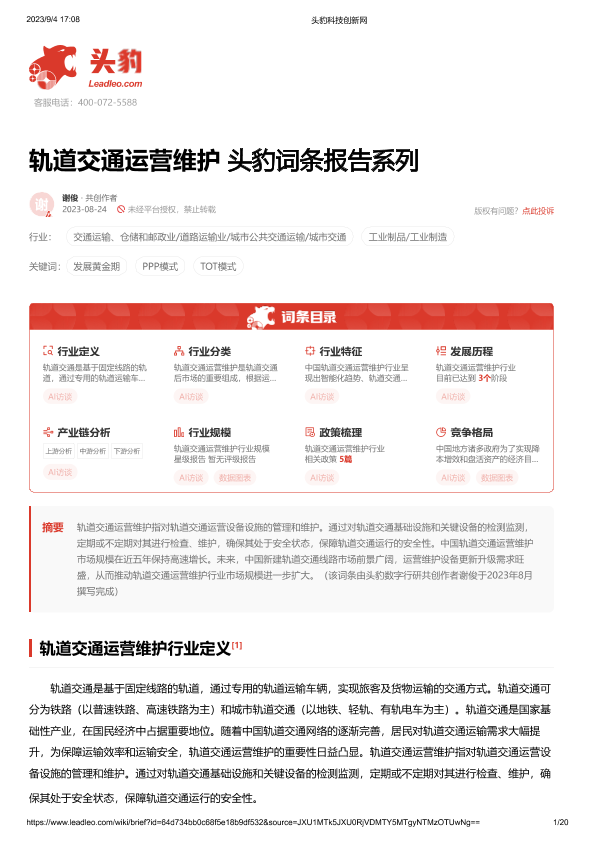 【头豹研究院】【20231019】轨道交通运营维护 头豹词条报告系列-20页