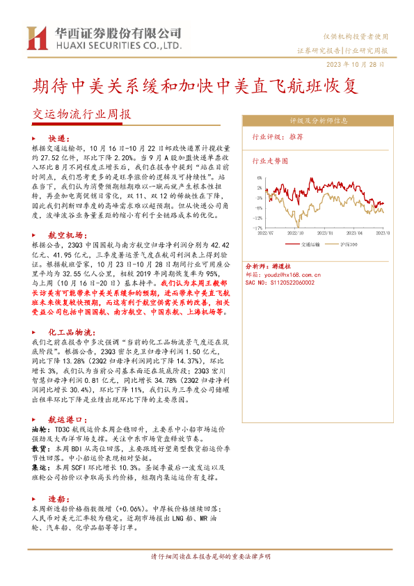 【华西证券】【20231028】交运物流行业周报:期待中美关系缓和加快中美直飞航班恢复-20页