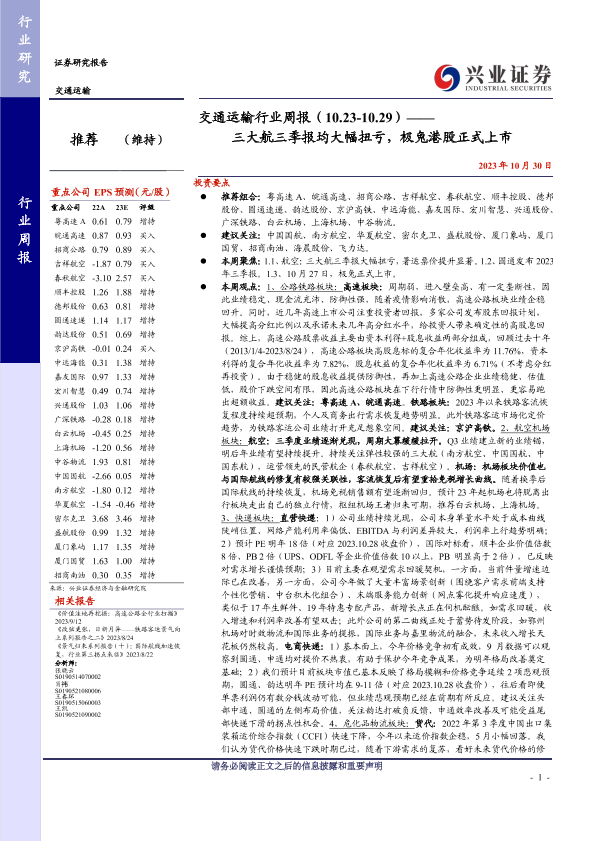 【兴业证券】【20231030】交通运输行业周报:三大航三季报均大幅扭亏,极兔港股正式上市-26页