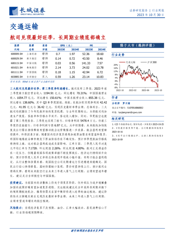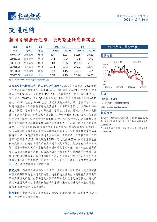 【长城证券】【20231030】交通运输行业周报:航司兑现最好旺季,长周期业绩底部确立-14页