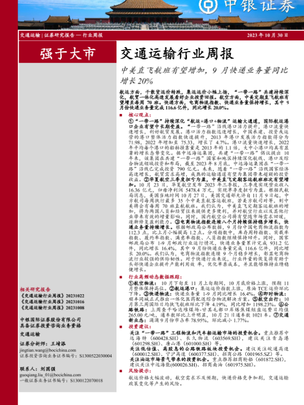【中银证券】【20231030】交通运输行业周报:中美直飞航班有望增加,9月快递业务量同比增长20%-31页