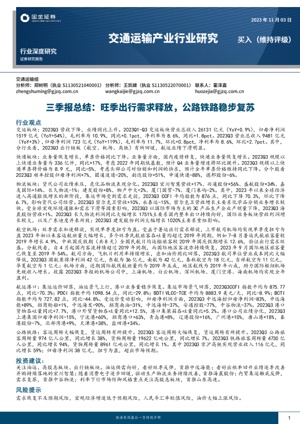 【国金证券】【20231103】交通运输产业行业研究:三季报总结:旺季出行需求释放,公路铁路稳步复苏-22页
