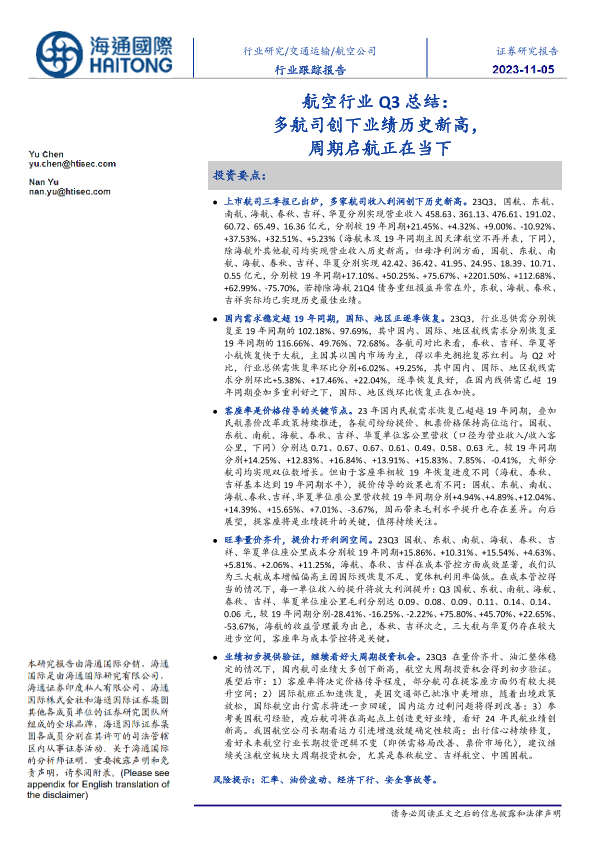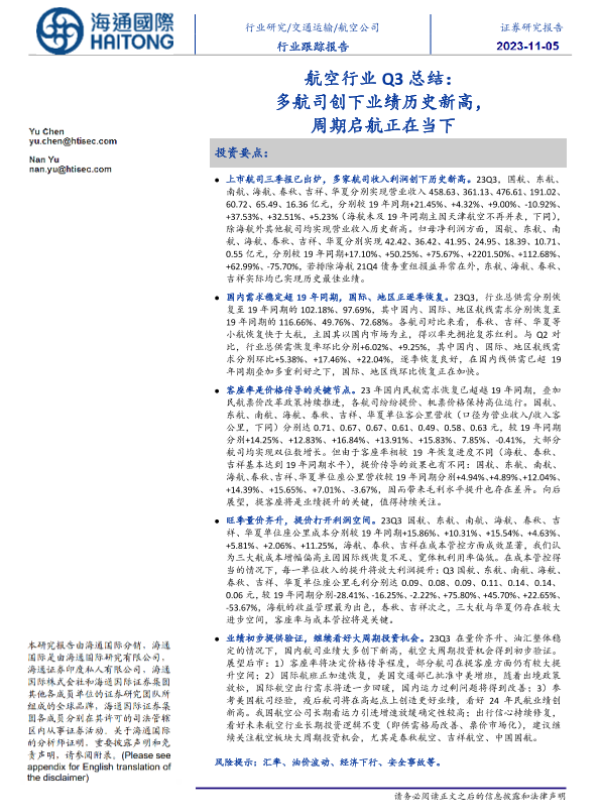 【海通国际】【20231105】航空行业Q3总结:多航司创下业绩历史新高新,周期启航正在当下-12页