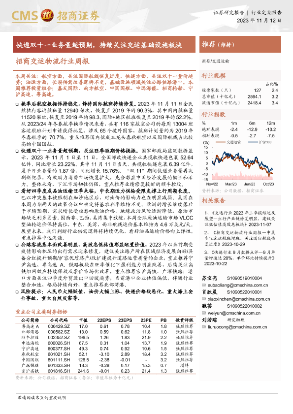 【海通证券】【20231112】招商交运物流行业周报:快递双十一业务量超预期,持续关注交运基础设施板块-17页