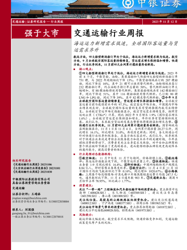 【中银证券】【20231112】交通运输行业周报:海运运力新增需求低迷,全球国际客运量与货运需求齐升-30页