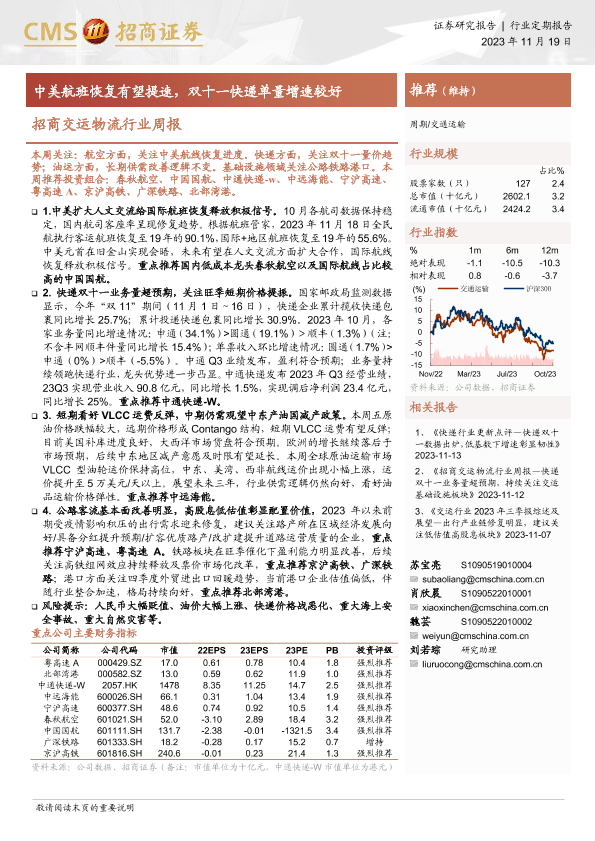 【海通证券】【20231119】招商交运物流行业周报:中美航班恢复有望提速,双十一快递单量增速较好-17页