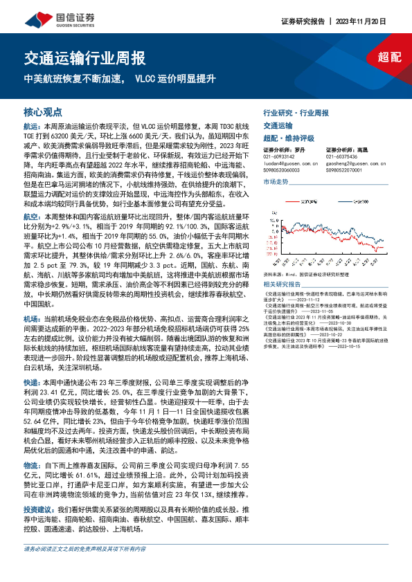 【国信证券】【20231120】交通运输行业周报:中美航班恢复不断加速,VLCC运价明显提升-20页