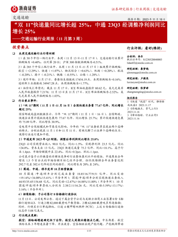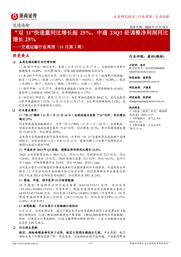【浙商证券】【20231118】交通运输行业周报:“双11”快递量同比增长超25%,中通23Q3经调整净利润同比增长25%-15页
