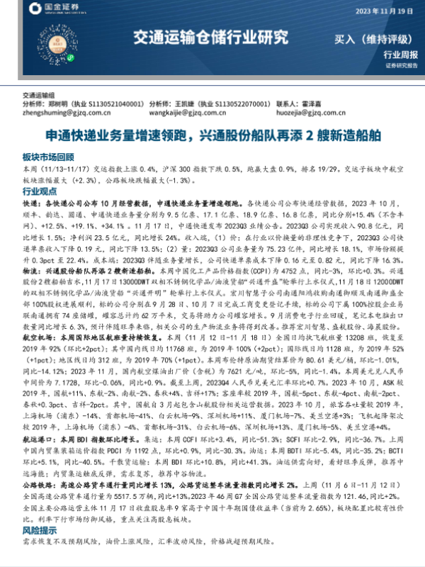 【国金证券】【20231119】交通运输仓储行业研究:申通快递业务量增速领跑,兴通股份船队再添2艘新造船舶-15页