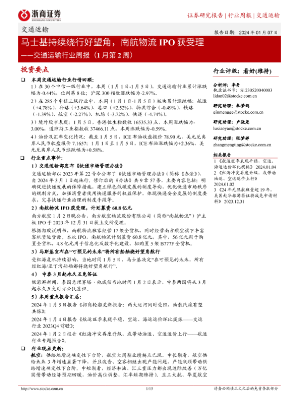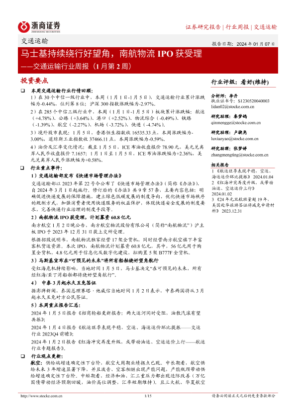【浙商证券】【20240107】交通运输行业周报:马士基持续绕行好望角,南航物流IPO获受理-15页