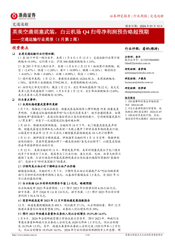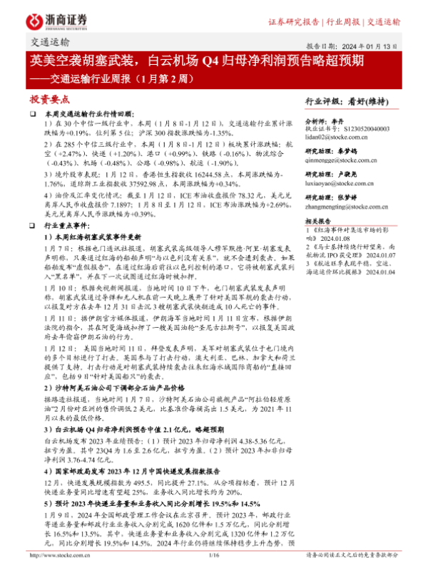 【浙商证券】【20240113】英美空袭胡塞武装,白云机场Q4归母净利润预告略超预期-16页
