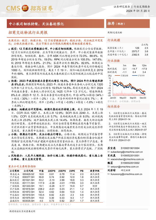 【海通证券】【20240120】招商交运物流行业周报:中小航司韧性持续,关注春运催化-16页