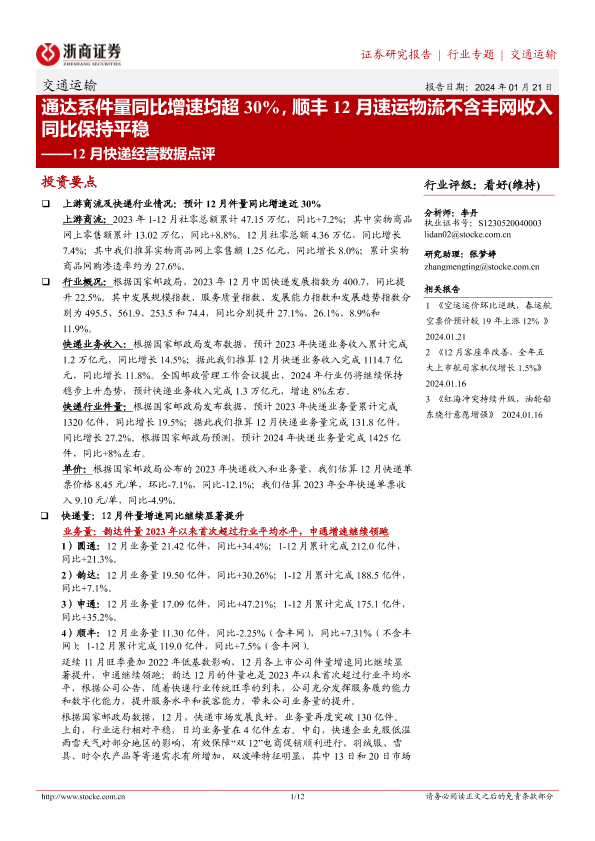 【浙商证券】【20240121】12月快递经营数据点评:通达系件量同比增速均超30%,顺丰12月速运物流不含丰网收入同比保持平稳-12页