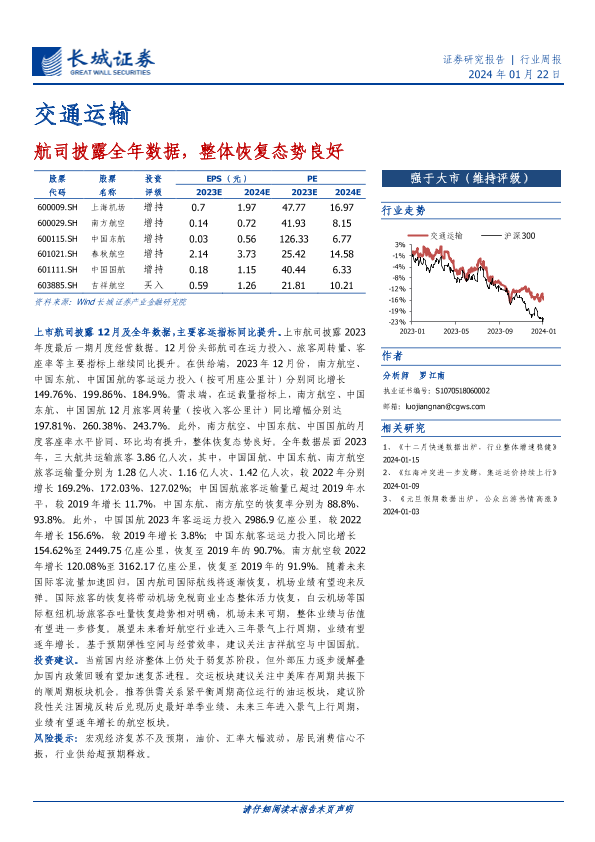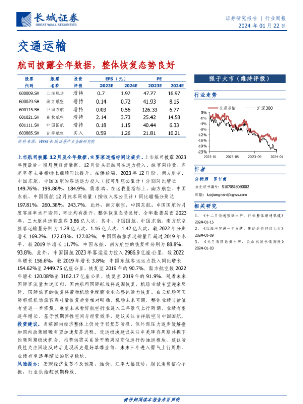 【长城证券】【20240122】交通运输行业周报:航司披露全年数据,整体恢复态势良好-14页